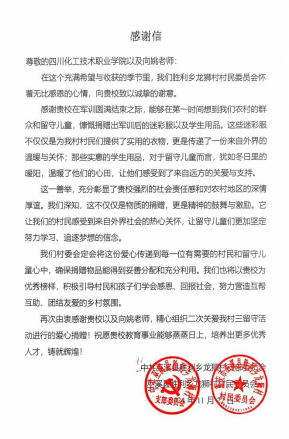 重庆市巫溪县胜利乡龙狮村支部委员会在给学校的感谢信中写道:“感谢贵校在军训圆满结束之际,能够在第一时间想到我们农村的群众和留守儿童,慷慨捐赠出军训后的迷彩服以及学生用品。这些迷彩服不仅仅是为我村村民们提供了实用的衣物,更是传递了一份来自外界的温暖与关怀;那些实惠的学生用品,对于留守儿童而言,犹如冬日里的暖阳,温暖了他们的心田,让他们感受到了来自远方的关爱与支持。”