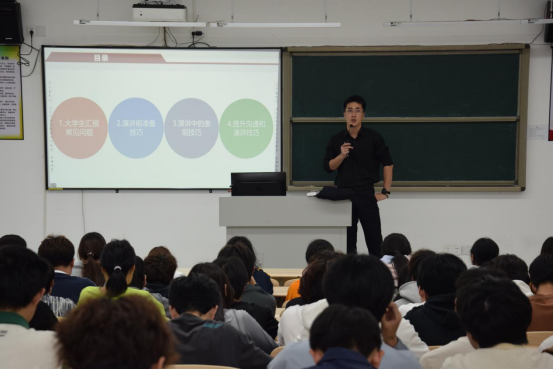 讲座过程中,拥有丰富实战经验的陈昱旭老师担任主讲。他从演讲的基本要素入手,逐步展开讲解,深入剖析了如何构建条理清晰的逻辑框架,以及怎样巧妙运用视觉辅助工具来强化表达效果。陈老师的讲解深入浅出、生动形象,同学们全神贯注,不时低头记录下关键要点,现场学习氛围浓厚。