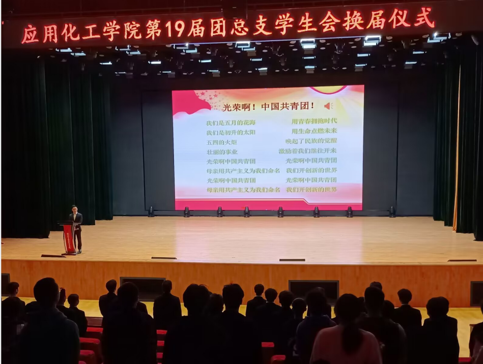 大会在雄壮的《义勇军进行曲》、《中国共青团团歌》中拉开帷幕。陈家森首先回顾了应用化工学院团总支学生会干部工作情况,对即将上任的学生干部提出殷切希望,希望学生干部们坚持不懈、以身作则,不仅要在工作中有雄心还应做出积极的实际行动。随后,党总支副书记屈超和团总支书记陈家森依次为学生干部颁发聘书和授牌,学生干部进行了集体宣誓。第十九届学生会执行主席申永吉,作为学生干部代表作了就职演讲。